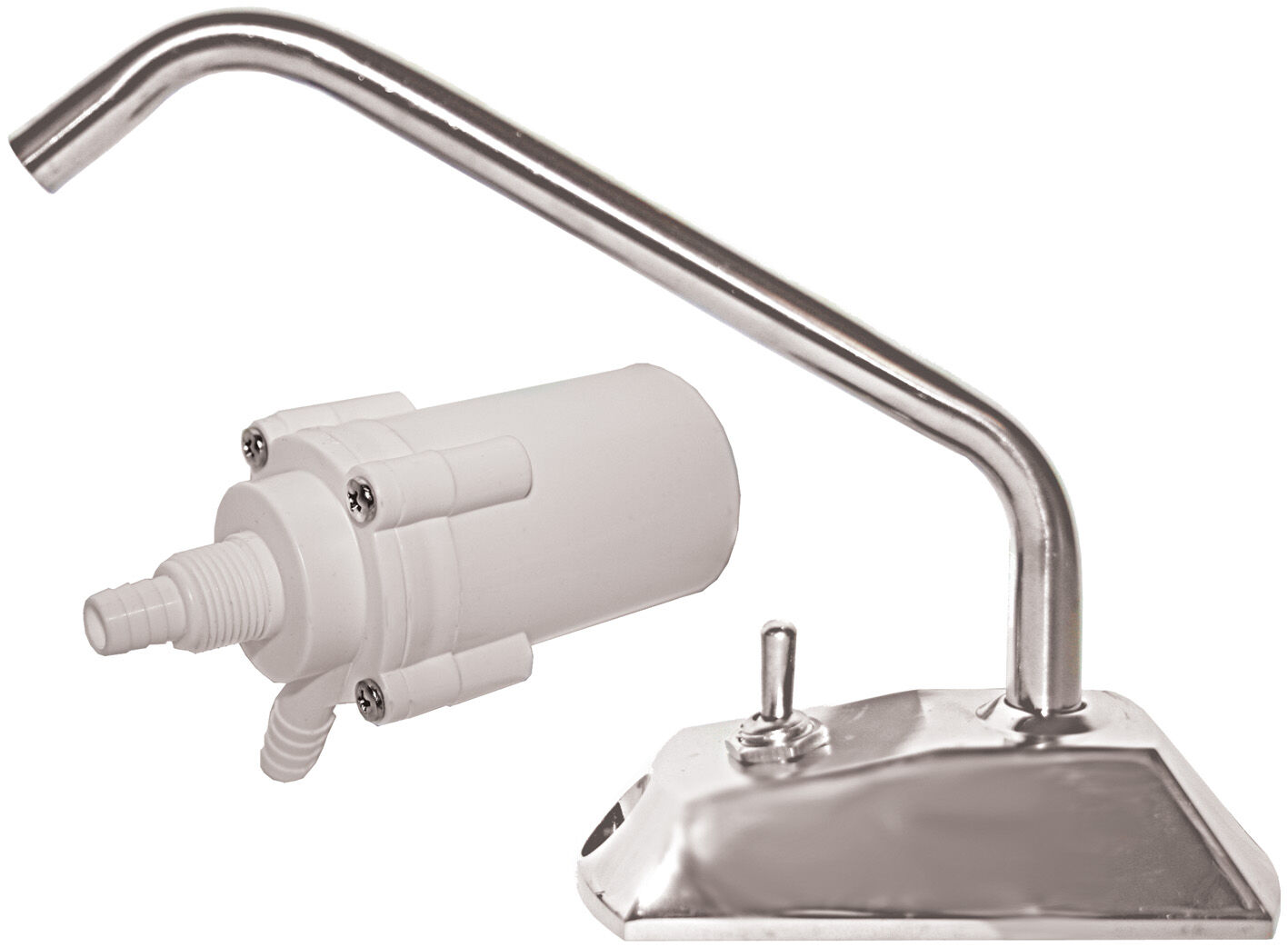 Economical TMC 12 volt galley pump system supplied complete with mounting bracket and chrome plated 12 volt electric faucet - so pump can be automatically activated by the toggle switch.