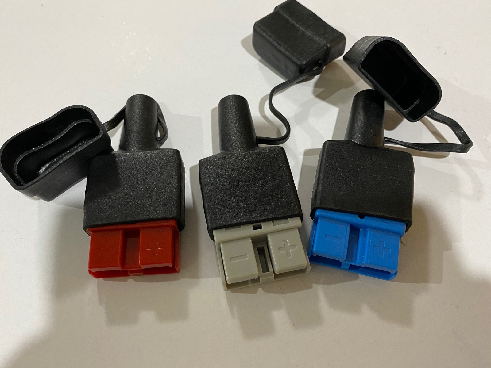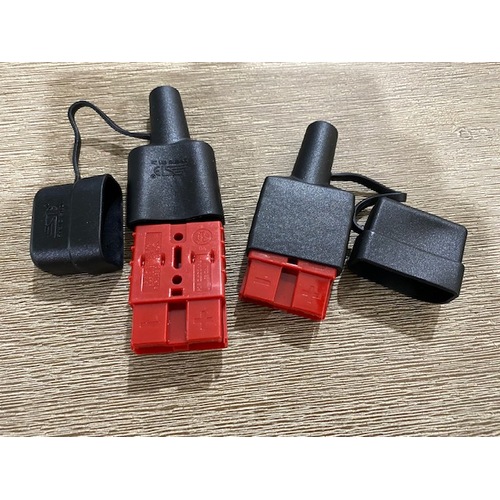 Pack of two red 50A  Anderson plug halves complete with rubber boots and caps for weatherproof seal.