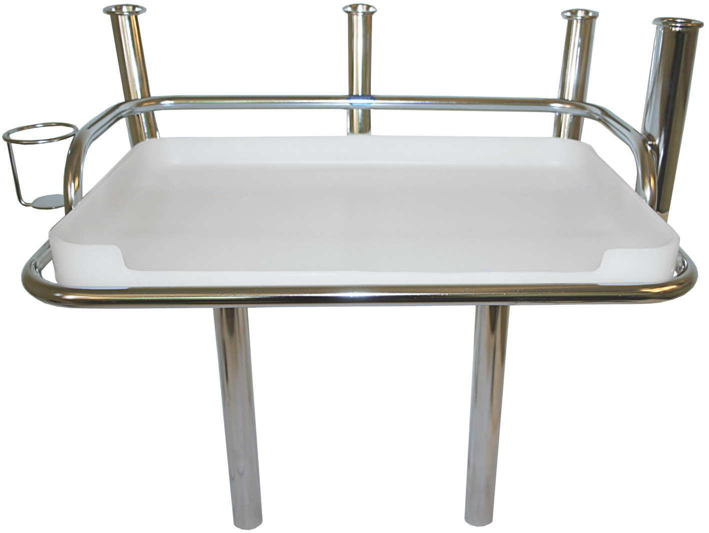 Incorporates four stainless steel rod holders, a drink holder, and a removable nylon cutting board for easy cleaning.
