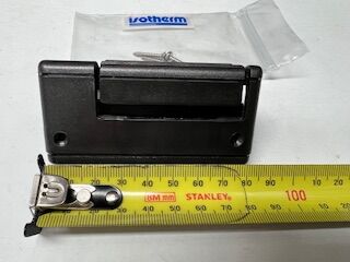 Black plastic replacement door handle with latch for Isotherm "Classic" Cruise refrigerators.