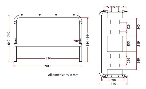Overall: 900mm (wide) x 330mm (deep) x 640 to 740mm (adjustable height)