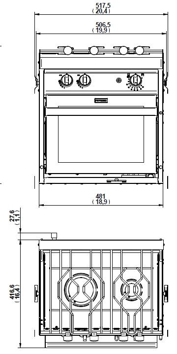 517 mm Wide x 417 mm Deep x 590 mm Height (to top of potholders (approx only).