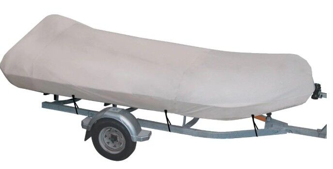 Grey polyester boat cover designed to fit inflatable boats with low consoles and outboard motors.