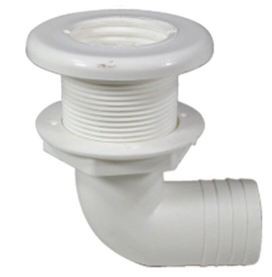A 90º injection moulded drain fitting installs in base of live tank, for connection to through hull, with minimal space requirement under live tank.