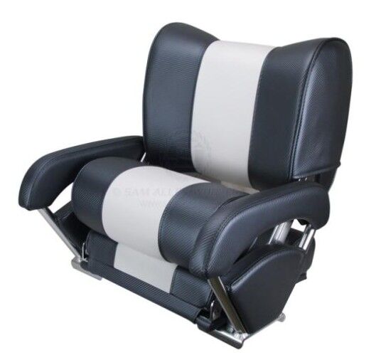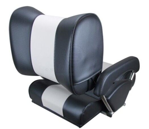 Single flip back boat seat with flip up thigh bauslter support, giving more space and comfort while standing.
