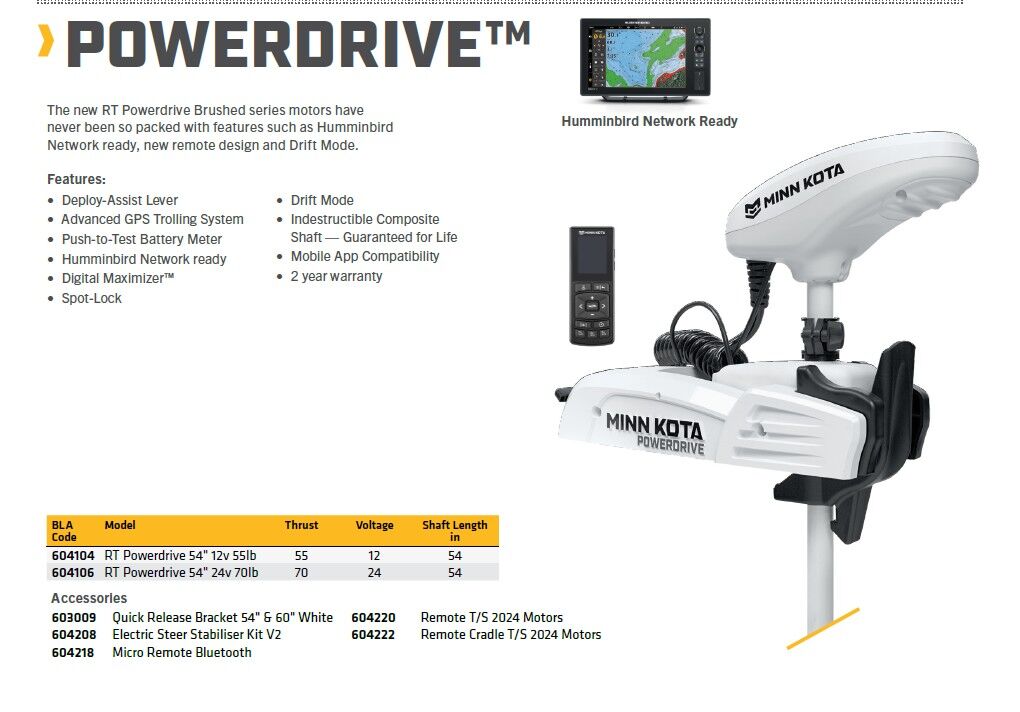 Compatible with either the standard Minn Kota wireless remote, the optional Micro remote, as well as the Networkable Humminbird or Minn Kota One Boat Network App.