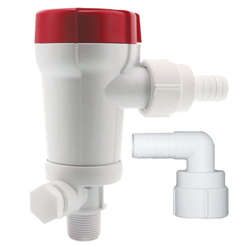 • Supplied with threaded rotatable glass filled nylon hose barbs: 1 x straight & 1 x 90 deg (20mm)