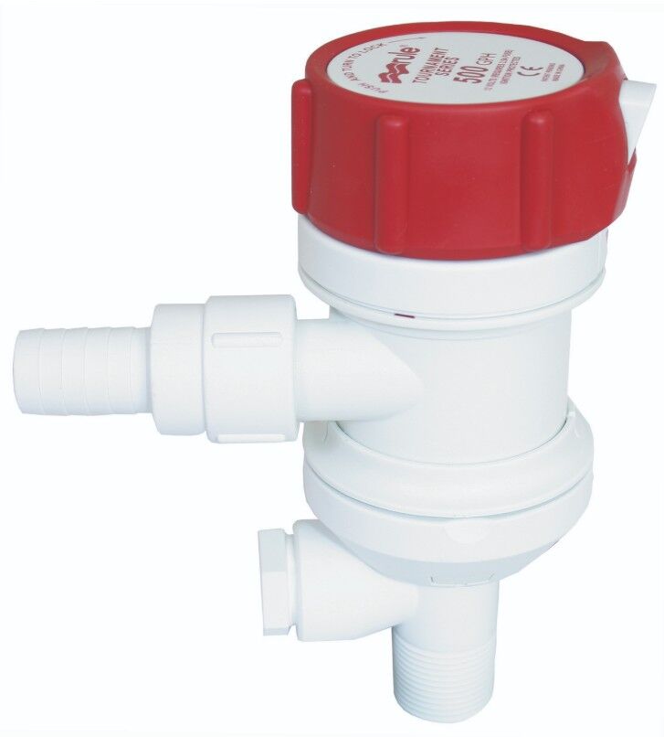 Rule’s tournament 400 series dual port thru-hull Livewell cartridge pump with 19mm (3/4") threaded valve inlet attached.