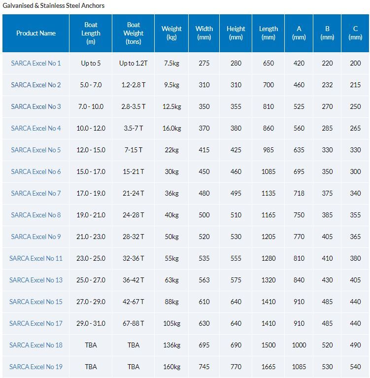 The Excel anchors are made to suit boats from 5 metres right up to 31 metres).