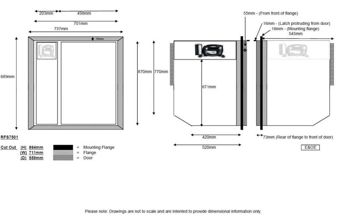 • Cut Out: 864 to 870mm (high) x 701mm (wide) x 520mm deep (excluding the door)