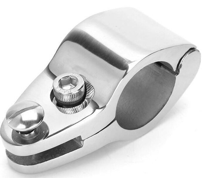 Sturdy, stainless steel hinged jaw coupling used to secure a bimini's frame tubing.