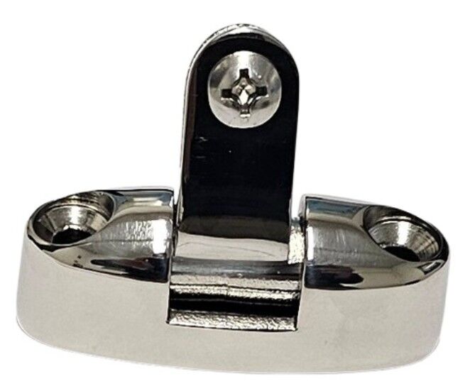 Sturdy, stainless steel, hinged, deck mount used to secure a bimini's frame tubing.