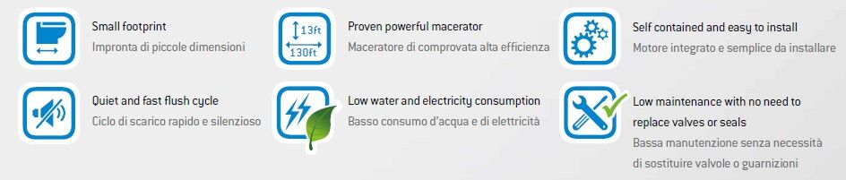 • Uses the consolidated ECO smart flush allowing to consume less water and power.