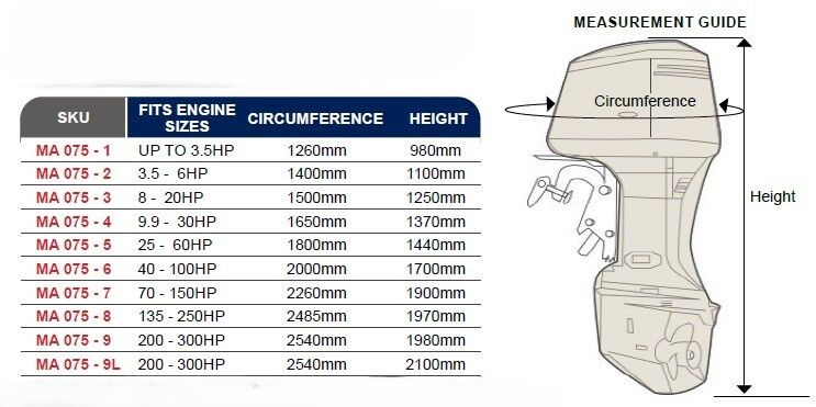 This universal fit cover suits both two and four stroke outbards - simply match the horsepower and check the height and circumferance measurements (see pic).