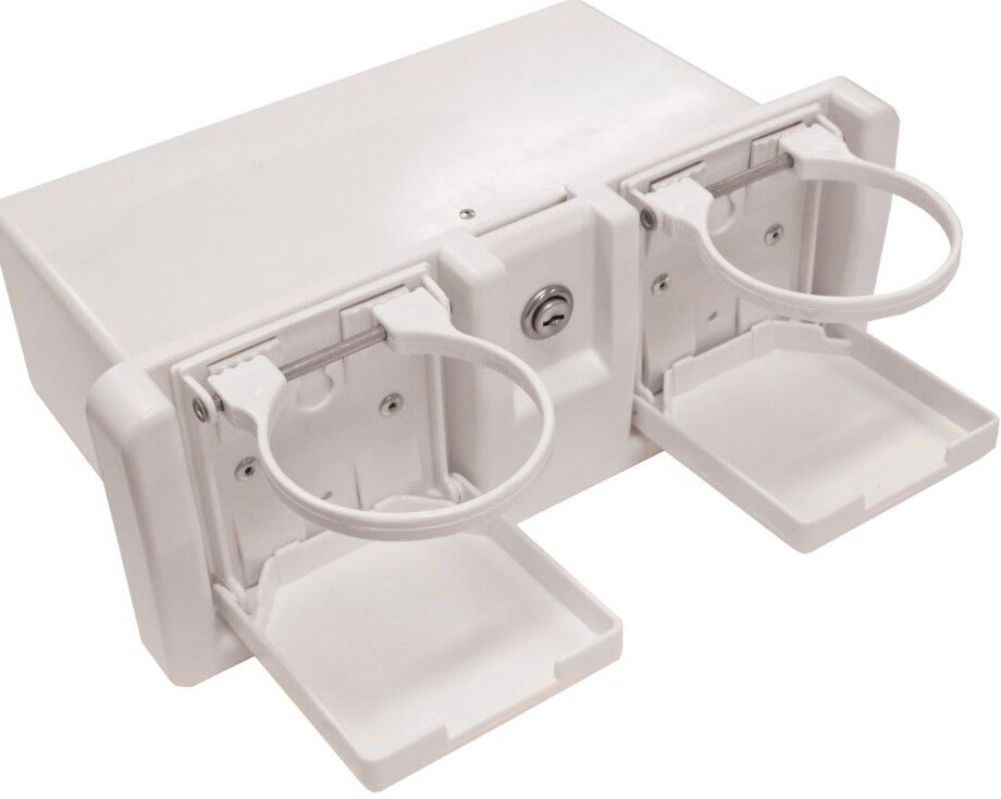 Lockable black boat glove box with two drink holders in the lid.